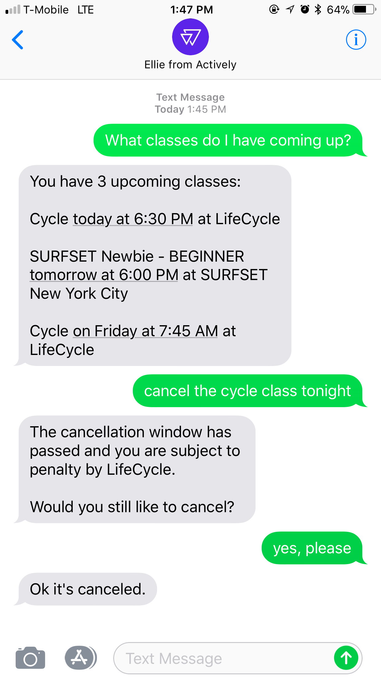 An AI-powered booking assistant for fitness classes and wellness experiences. The assistant is capable of booking, canceling, and rescheduling activities through text message conversations and with smart assistants.